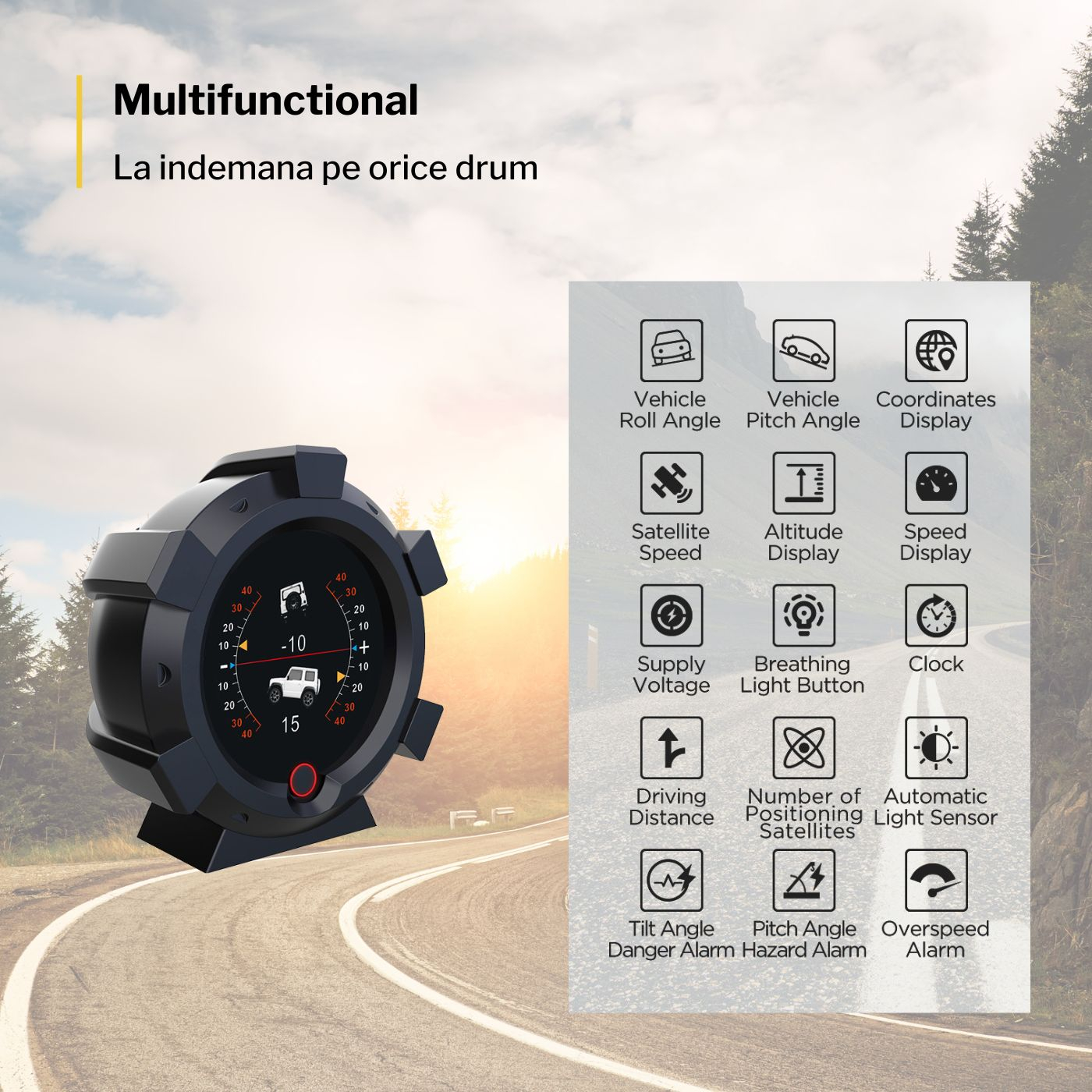 Principala functie pentru care a fost dezvoltat acest produs este aceea de va ajuta in aprecierea cat mai exacta a gradului de inclinare laterala atunci cand circulati cu autovehicolul intr-un mediu off-road, functie care poate preveni rasturnarea acestuia, dar si a unghiului de tangaj, informatie utila in cazul abordarii pantelor sau rampelor mai abrupte.