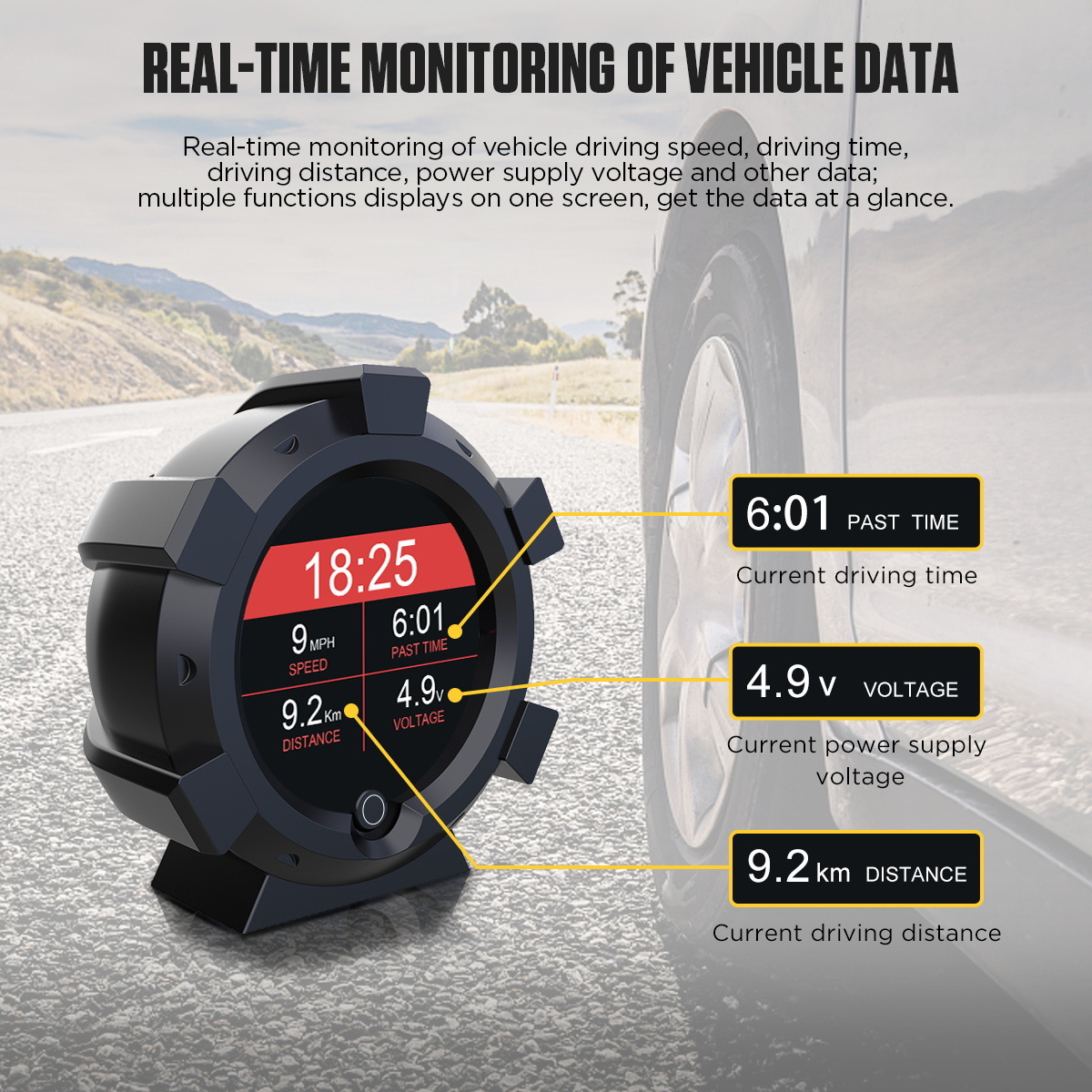 Monitorizarea in timp real a vitezei de conducere a autovehicolului, a timpului de condus, a distantei de parcurs, a tensiunii de alimentare si a altor date. Afiseaza functii multiple pe un singur ecran, ceea ce ofera un avantaj.