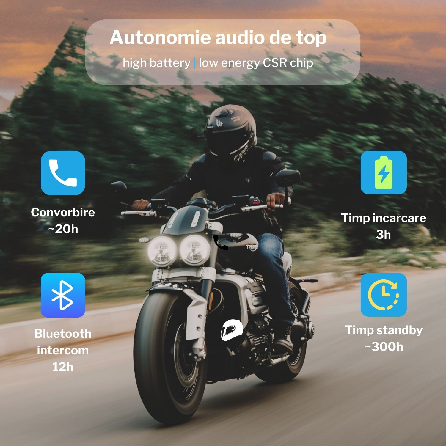 Comunicarea va fi in modul full-duplex si vine cu functia de apeluri simultane. Pin intermediul castilor cu care este prevazut pachetul M1-S AIR, va puteti asigura securitatea si confortul hands-free, puteti asculta muzica, prelua rute GPS si emite comenzi vocale wireless folosind functia de Bluetooth.