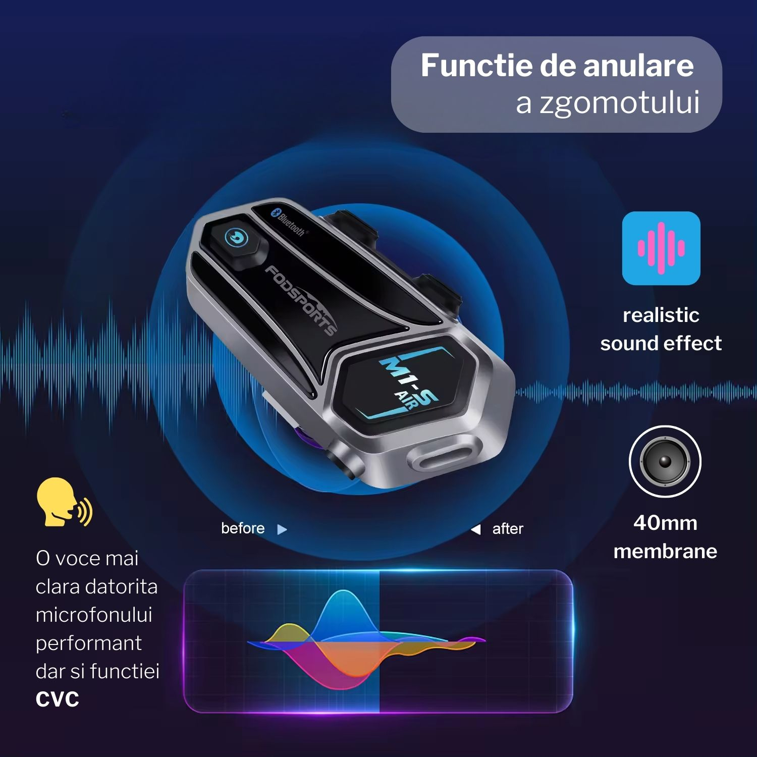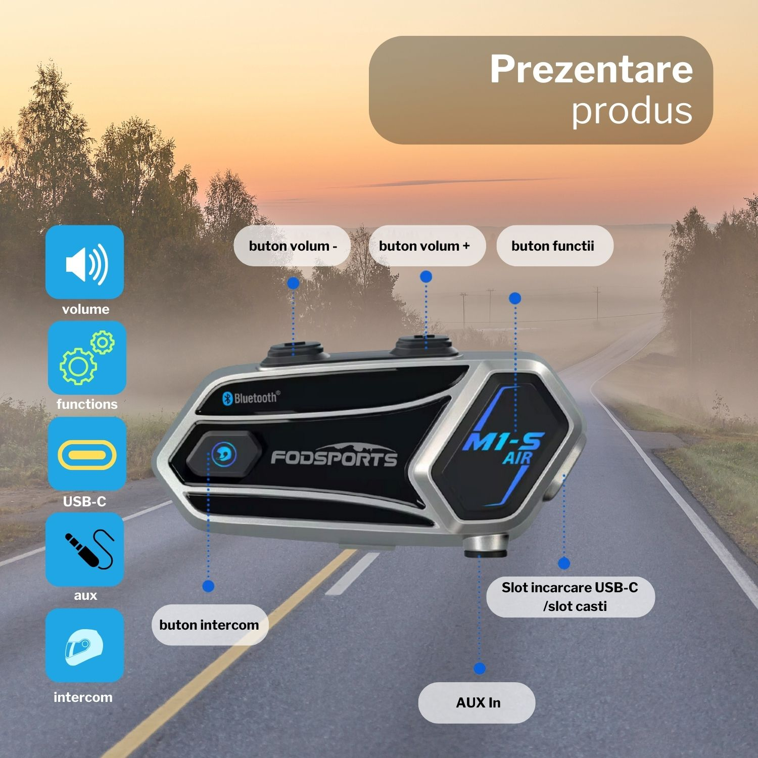M1-S AIR este un sitem de comunicare audio prin Bluetooth, folosit de catre pasionatii de calatorii pe doua roti, pentru a comunica intre ei, a asculta muzica sau a prelua apeluri in timp ce conduc. Modelul de fata este un produs nou in gama celor de la Fodsports si a fost special conceput pentru a oferi performante de top si in acelasi timp pentru a satisface cele mai inalte standarde in materie de sisteme intercom. M1S-AIR si M1S-PRO fac parte din aceeasi gama de produse, AIR fiind modelul de baza iar PRO cel avansat. Singurele aspecte care le diferentiaza sunt numarul de rideri si distanta de comunicare.
