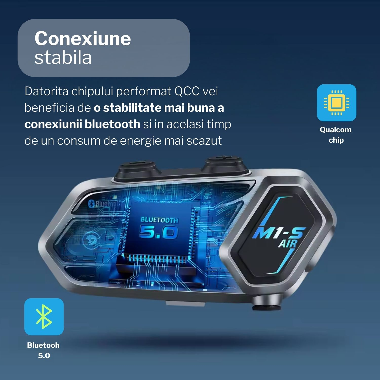M1S-AIR vine echipat cu ultima versiune de Bluetooth (5.0), care ofera o compatibilitate si o stabilitate imbunatatita fata de multe alte modele existente pe piata. Daca nu exista obstacole cum ar fi cladiri foarte inalte, interfonul poate oferi o conexiune maxima de pana la 1000m in linie dreapta, insa distanta efectiva intre doua motociclete, cu o conexiune clara, este de 500m.