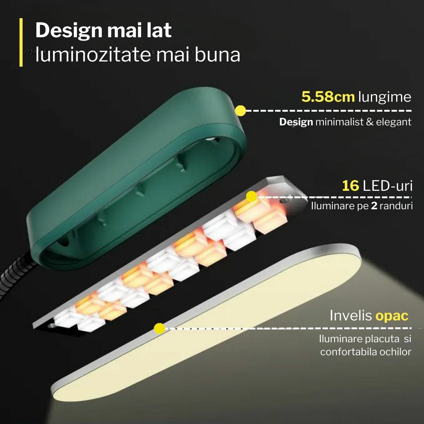 Lampa LED pentru citit cu touch, portabila, 16 LED-uri, 3 culori, 5 moduri intensitate luminoasa, incarcare USB, 1000mAh, lumina albastra redusa, Verde
