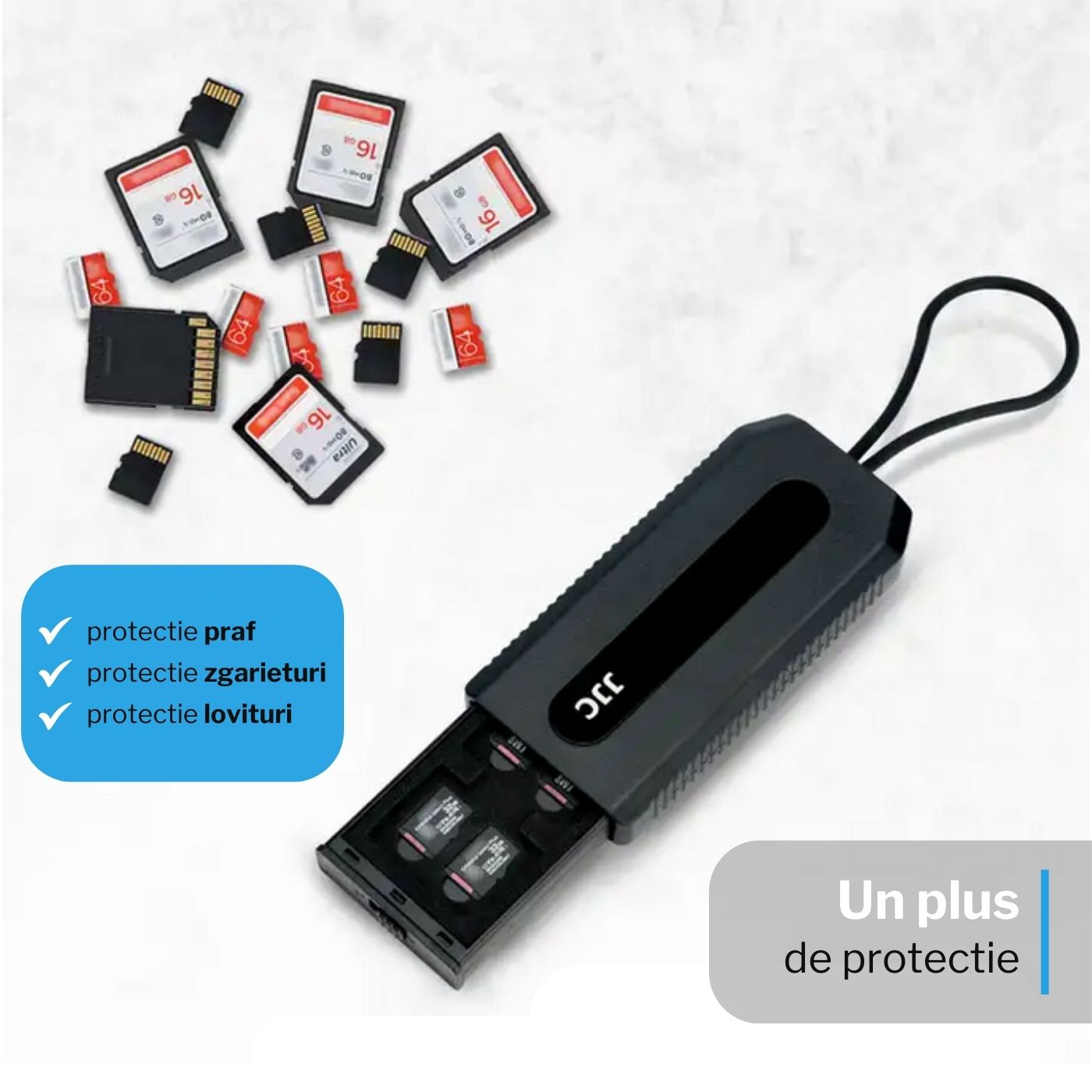 Produsul are 2 componente: o carcasa exterioara cu rol de protectie si o parte interioara, utila pentru depozitarea cardurilor de memorie.