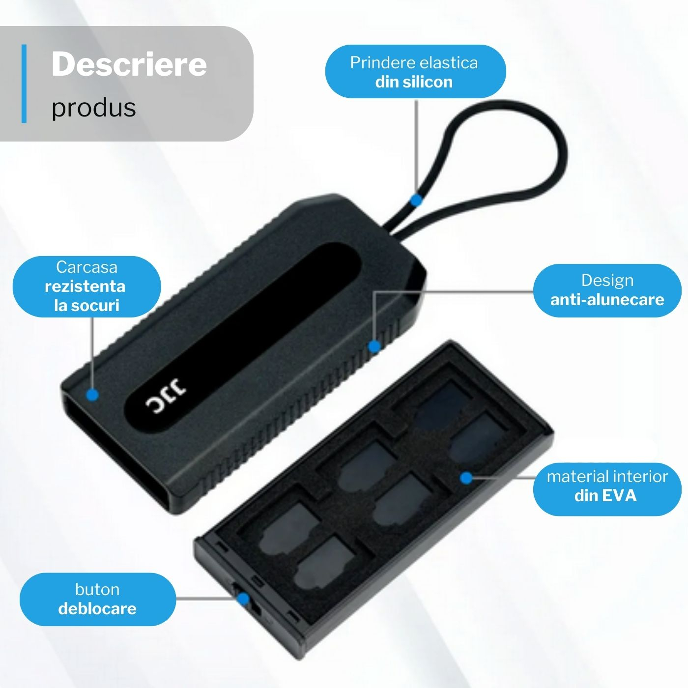 Carcasa pentru carduri de memorie din seria JJC MCK este realizata din material de inalta calitate, ecologic, robust si durabil menita sa va faca viata mai simpla si astfel sa va protejeze cardurile de memorie oridunde v-ati afla. Ea iti poate proteja eficient cardurile, iti poate usura munca, ti le poate feri de praf sau de eventuale pierderi atunci cand te afli pe drum iar faptul ca le poti stoca intr-un singur loc te va face mai organizat.