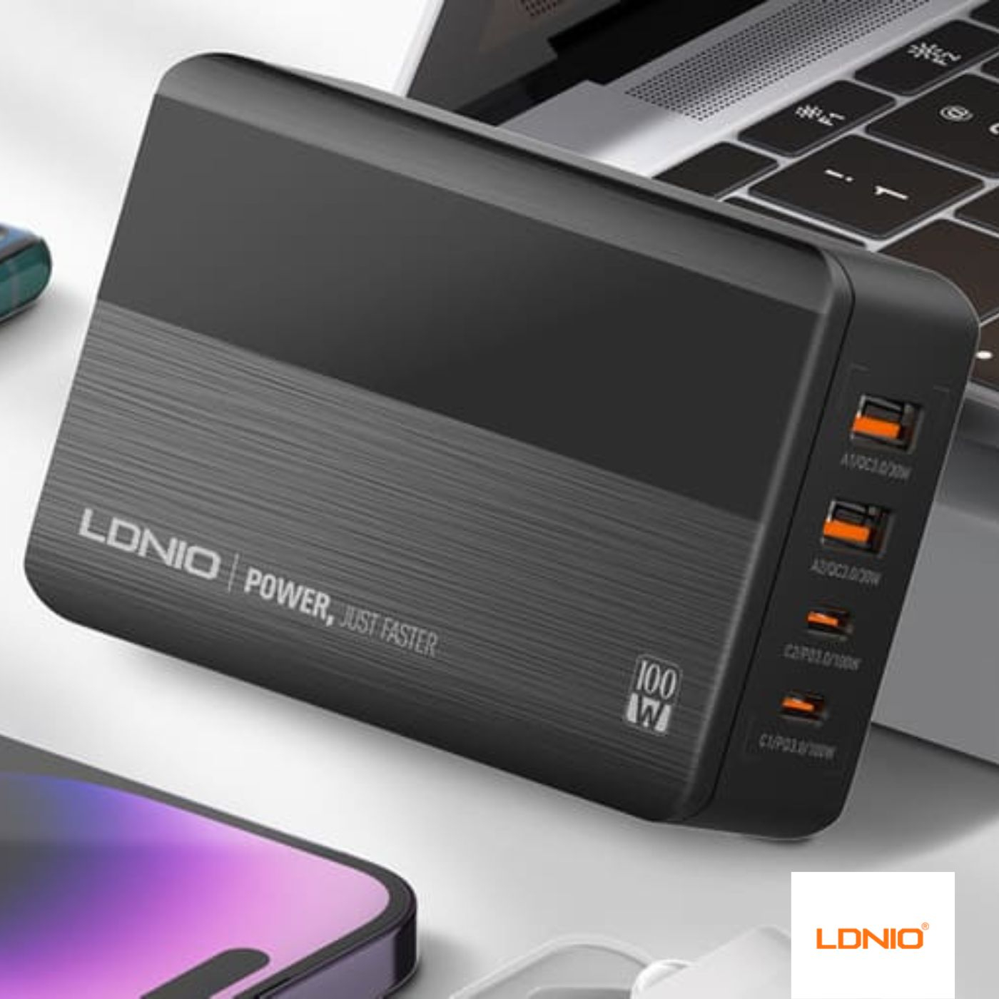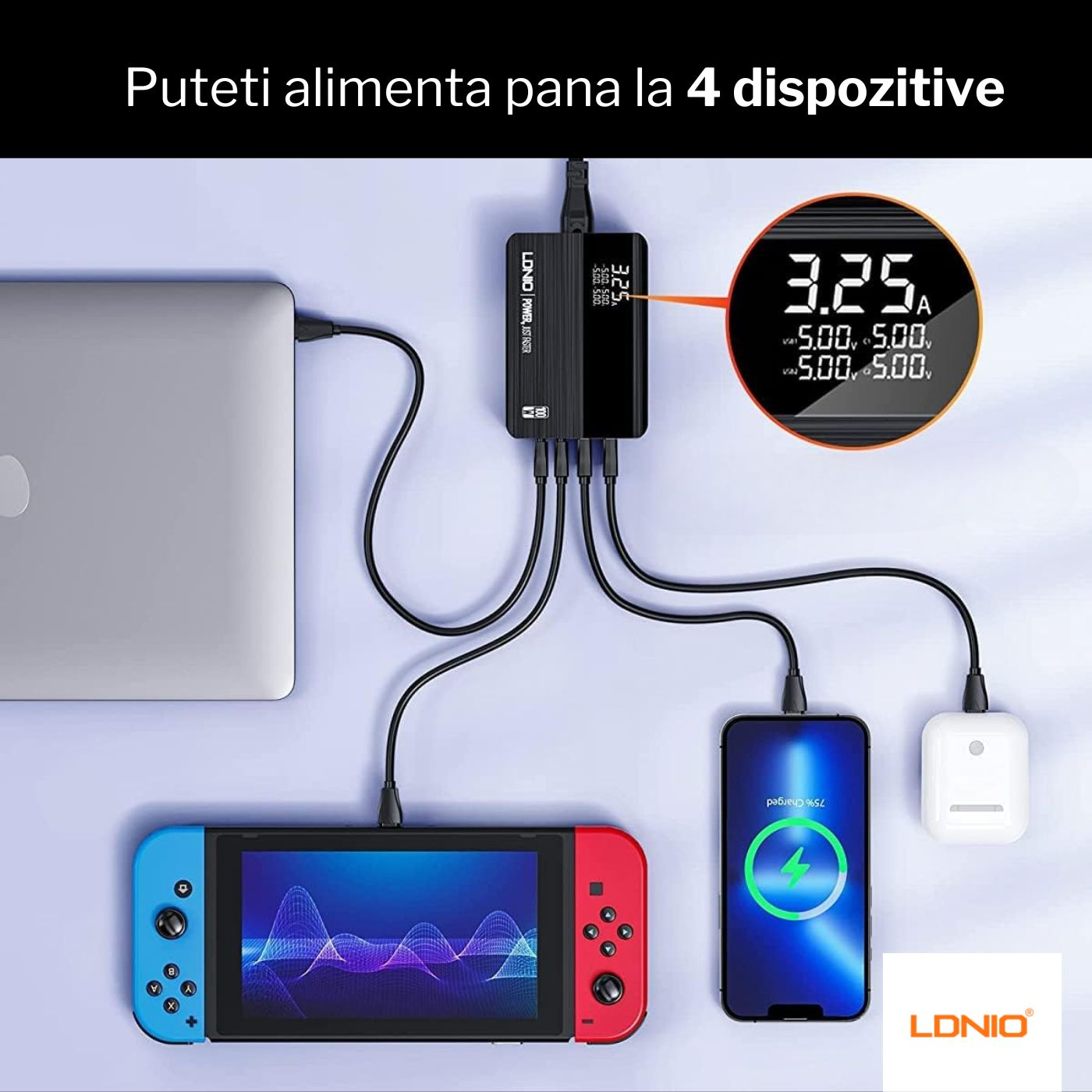LDNIO Incarcator USB ultra rapid (GaN) cu putere de 100W LDNIO - 2809C, 2X PD(100W), 2X QC(65W), afișaj LCD, protecții multiple, portabil, util incarcare laptopuri si tablete, Negru