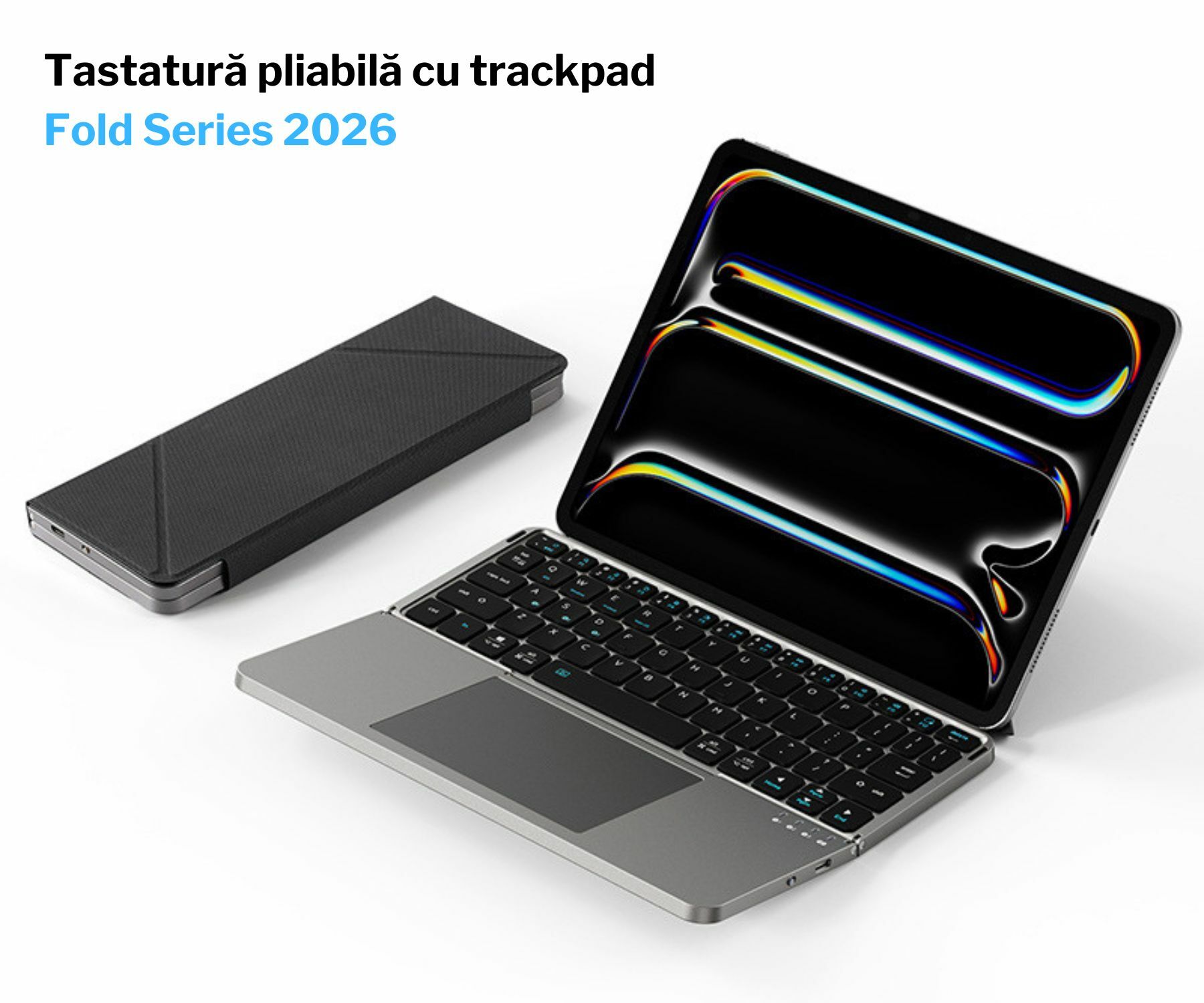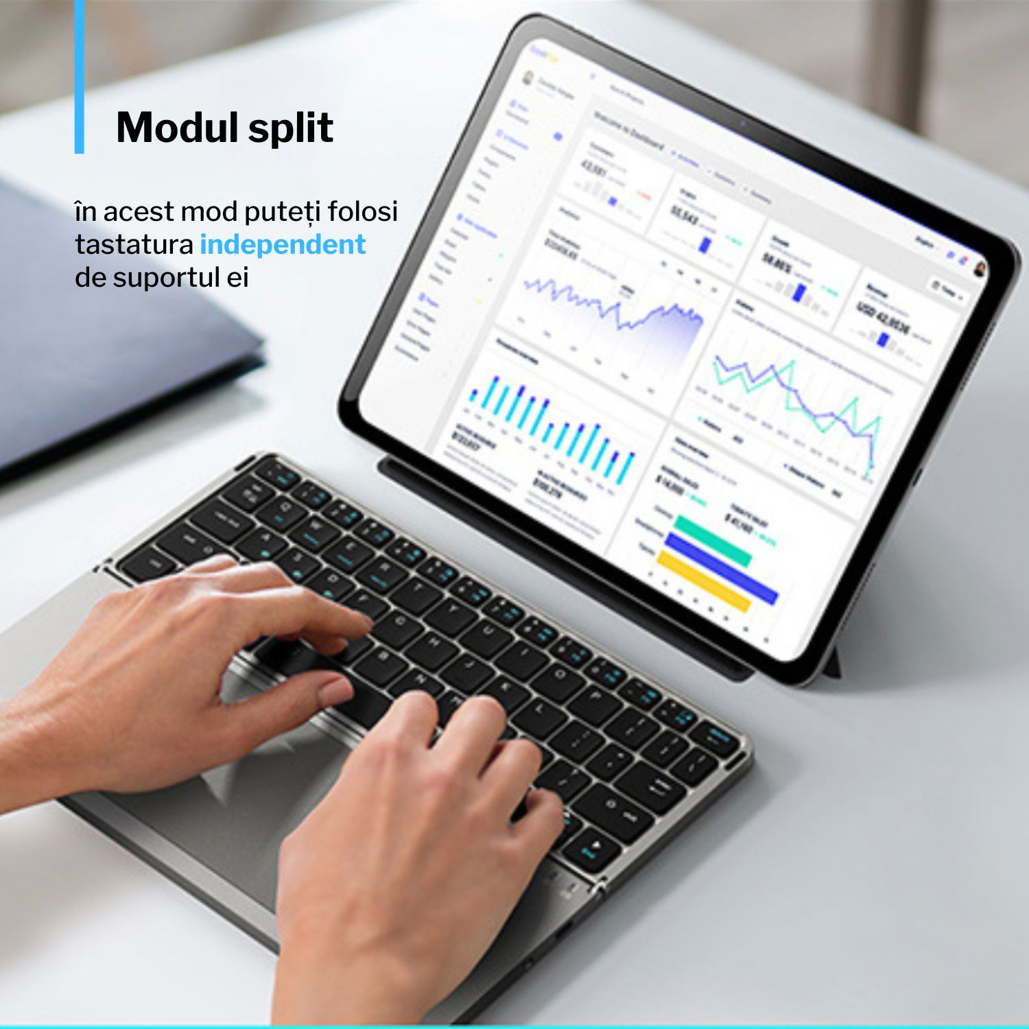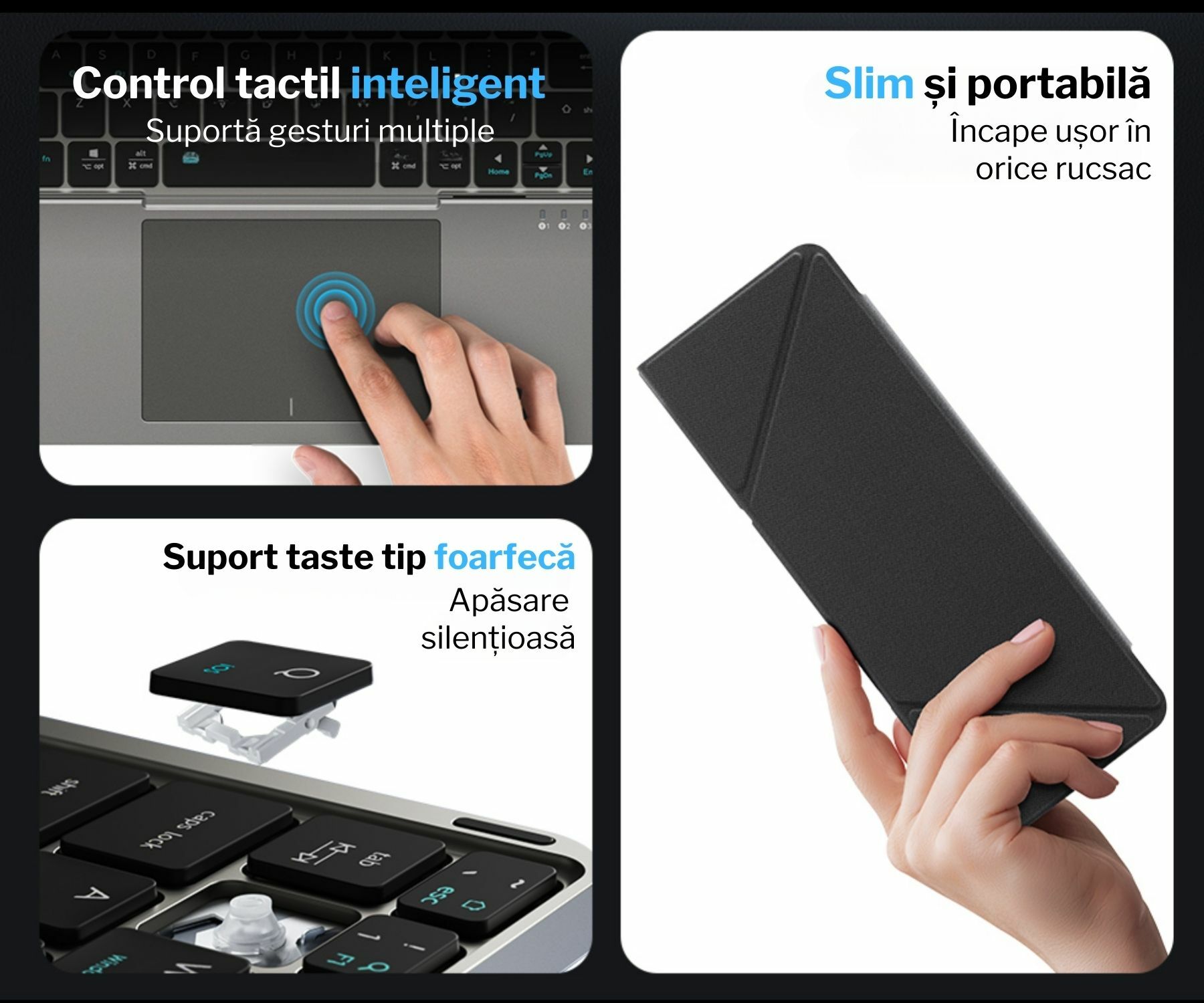 Mecanismul de pliere este stabil și durabil, oferind o suprafață fermă in timpul utilizării și protecție suplimentară atunci cand tastatura este inchisă. Deschizi, conectezi și incepi să lucrezi imediat — fără configurări complicate.