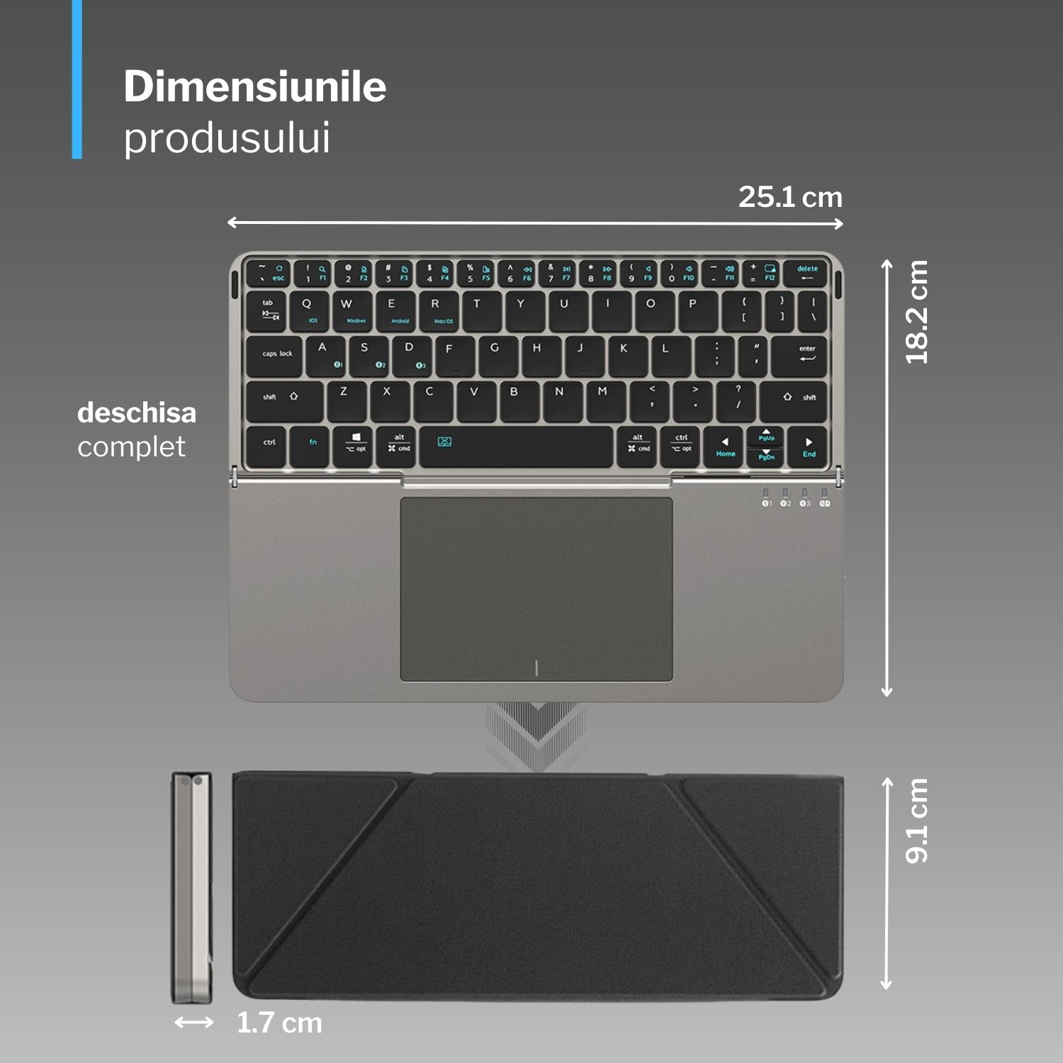 - dimensiune tastatură pliată: 251 x 91 x 17 mm