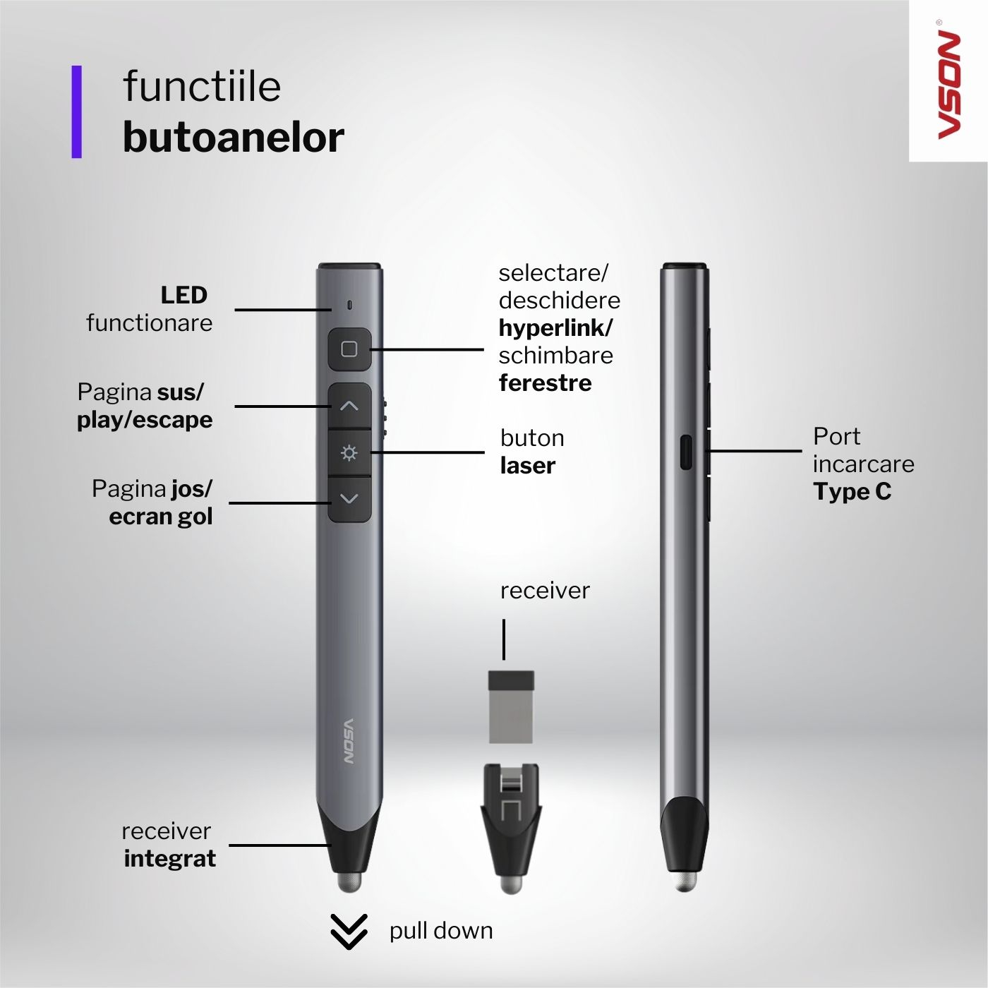 Functii: Indicator laser, Stylus capacitiv, Pagina sus/jos, Play/Esc, Ecran gol, Hyperlink, Comutare ferestre etc.