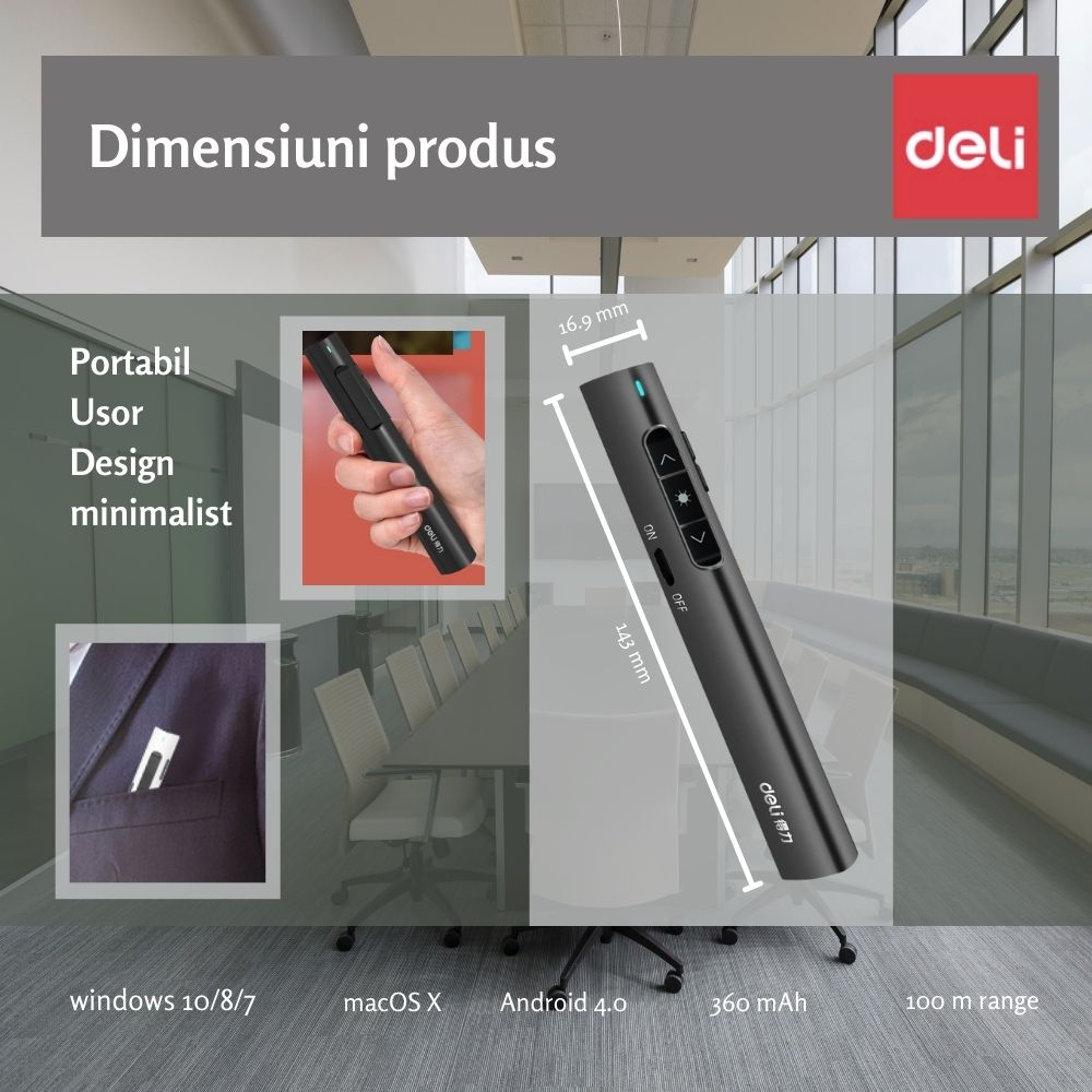 Construit cu atentie la detalii, cu un design minimalist, usor si ergonomic, laserul pentru prezentari Deli 2801 reprezinta o alegere excelenta pentru o prezentare de calitate. Se afla la a treia generatie si vine cu imbunatatiri precum hyperlink, window switch, one-click control, moduri care vin in ajutorul tau si ofera un plus de versatilitate.