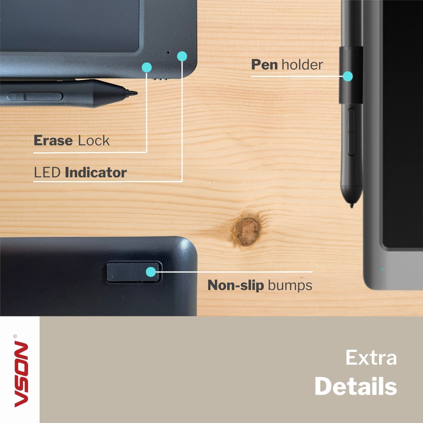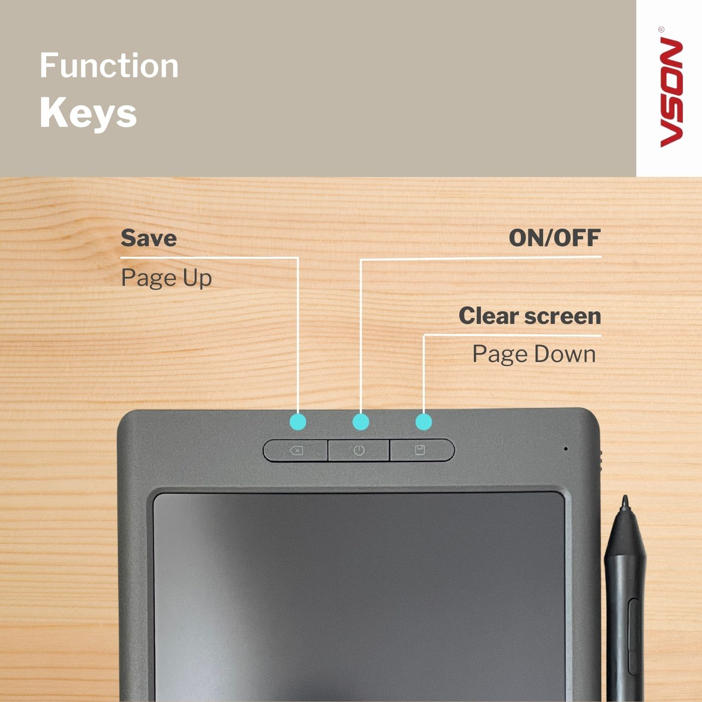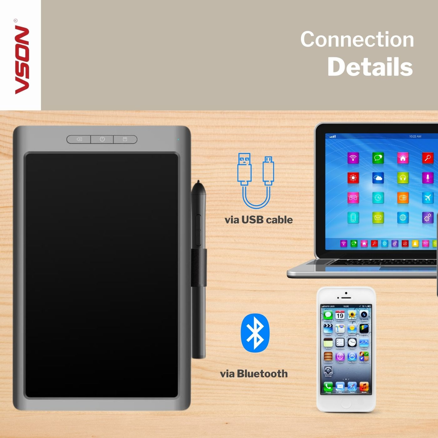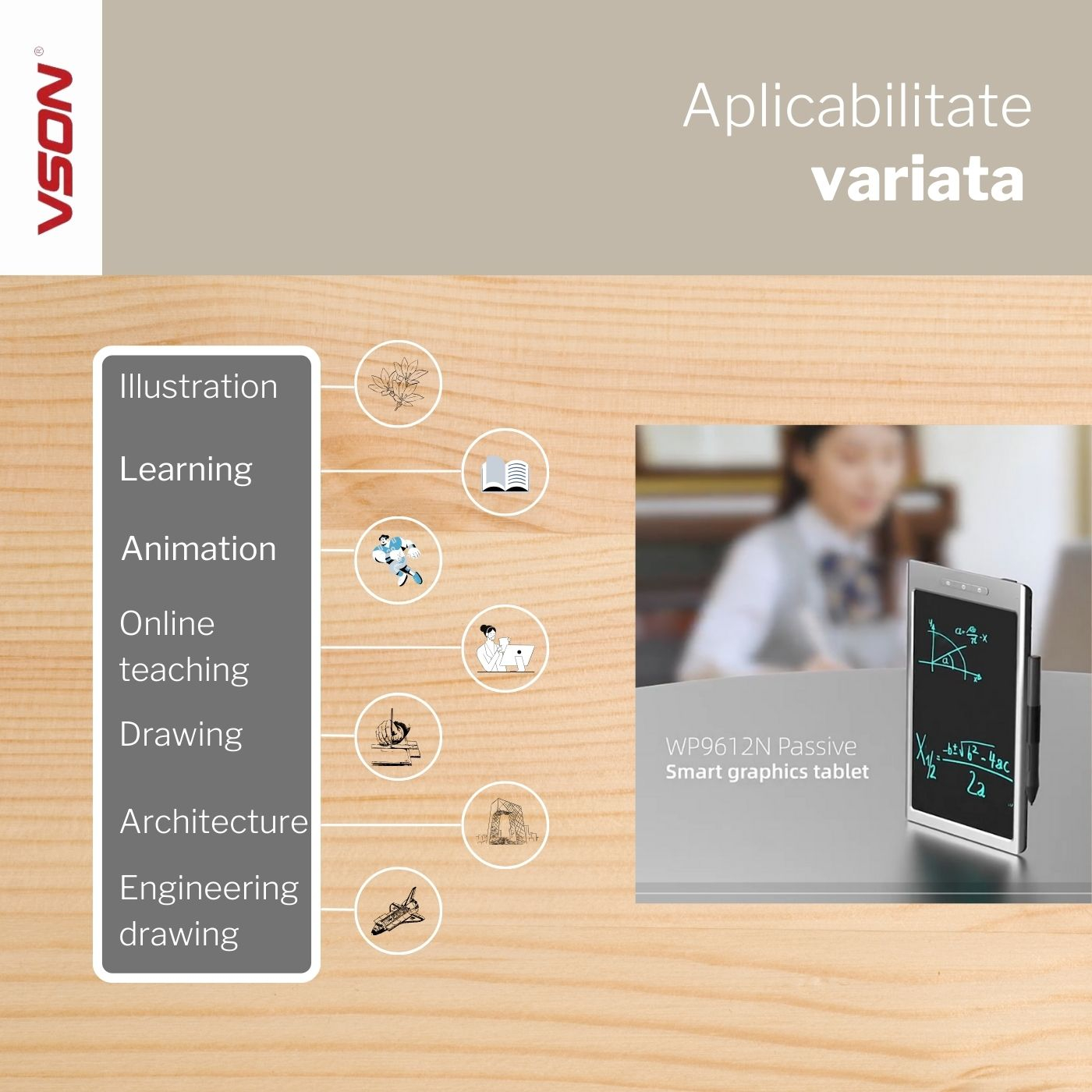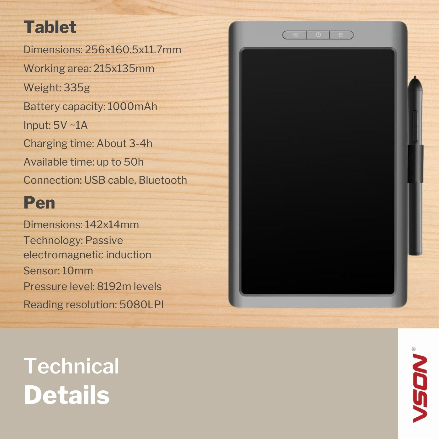Tableta grafica pentru copii si adulti VSON VP9612N, ecran monocrom, stilus 5080LPI, 8192 niveluri presiune, conexiune Bluetooth sauUSB, 1000mAh, aplicatie inclusa, Gri